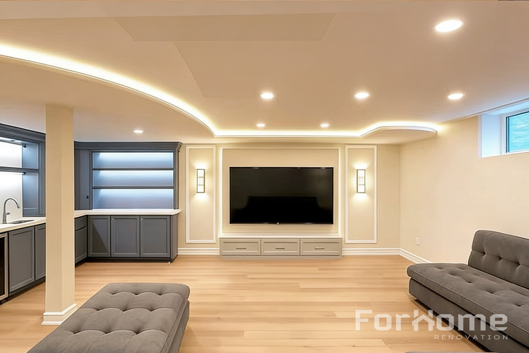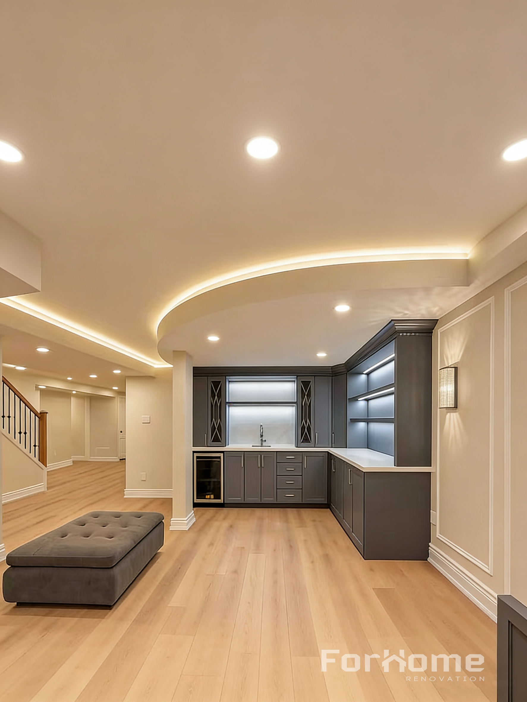 Design details such as the curved ceiling with LED strip lighting, custom feature wall, and built-in bar area give the basement a modern and stylish look while maximizing functionality.